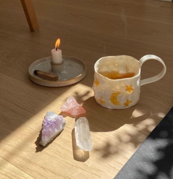 Fresh filtered water, gently mineral-infused through natural stones to support grounding and energetic balance.➕ Cleansed & Prepared Space