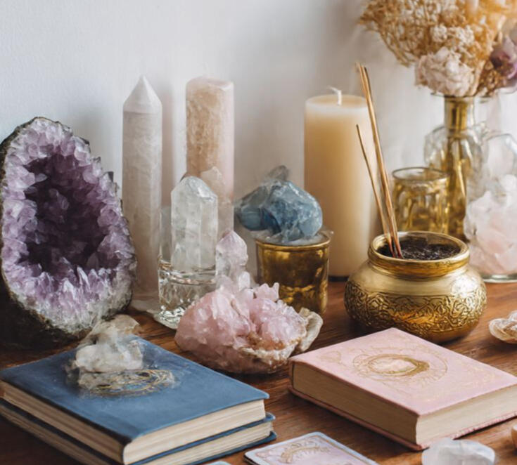 Fresh filtered water, gently mineral-infused through natural stones to support grounding and energetic balance.➕ Cleansed & Prepared Space